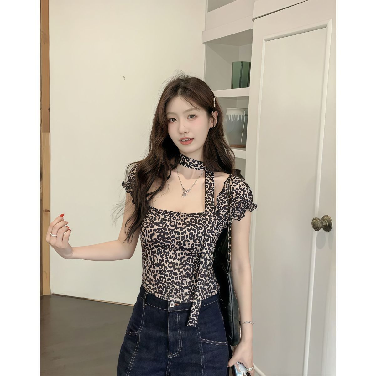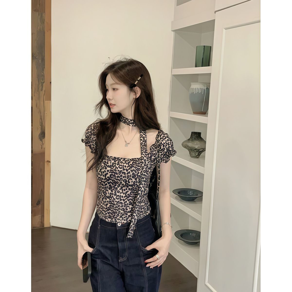 Retro Sassy Womens T-shirt With A Square Neckline Leopard Print And Short Sleeves